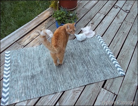 Here’s an up close of the rug…it’s woven but it has started to wear and fray but only at the ends. I washed it this past weekend and even though the ends have been sewn down several times, it had frayed beyond repair. So I was sitting at the sewing table with scraps from my last project around me. And then I started thinking, and then this happened!